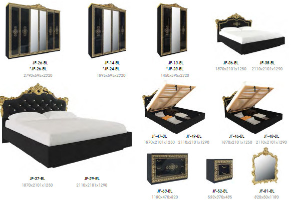 Спальний комплект виглядає розкішно і вишукано,такий ефект дає поєднання глянсовій чорній поверхні з золотим декором . Меблі "Дженіфер" відрізняються високою якістю виконання, вона практична, містка і функціональна. Виготовлена спальня з ламінованого ДСП , направляючі на шухлядах комодів і тумб телескопічні (металеві з металічними кульками) що гарантує легкість та зручність у використанні. У нашому магазині ви можете придбати наступні елементи спального гарнітура з серії "Дженіфер": шафи 3-дверні, 4-дверні та 6-дверні з великими гарними дзеркалами, які візуально розширюють простір кімнати, комод і тумба, ліжка декількох розмірів і видів. Матрац для ліжка ви можете придбати окремо в нашому магазині.